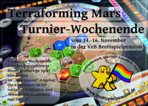 Terraforming Mars ist eines unser absoluten Lieblingsspiele und schon lange überlegen wir, wie es sich bewerkstelligen läßt, ein (trotzdem freundschaftliches!) Turnier zu veranstalten. Für eine 1-Tages-Veranstaltung ist die Spielzeit einer einzelnen Runde einfach zu lang. Nun ist es endlich so weit: geplant ist das Turnier über 3-4 Runden, die erste am Freitagabend nach dem Abendessen, und dann je nach Teilnehmerzahl und Möglichkeiten der Teilnehmenden 2-3 Runden am Samstag und das Finale dann entweder am Samstag Abend, oder wenn es allen passen sollte, nach Absprache, am Sonntag Vormittag (die Checkout-Zeit wäre in diesem Fall natürlich egal).
